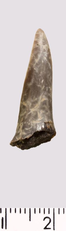 Зуб (фрагмент). Акула. Scapanorhynchus gigas Woodward, 1889. Классификация: Хордовые Chordata, Позвоночные Vertebrata, Хрящевые рыбы Chondrichthyes, Пластиножаберные Elasmobranchii