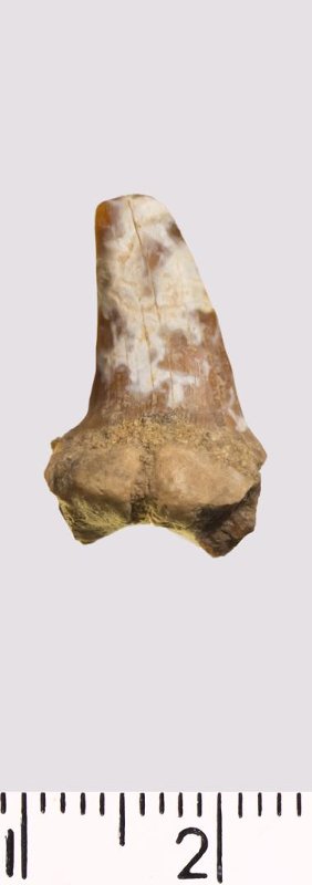 Зуб (фрагмент). Акула. Scapanorhynchus gigas Woodward, 1889. Классификация: Хордовые Chordata, Позвоночные Vertebrata, Хрящевые рыбы Chondrichthyes, Пластиножаберные Elasmobranchii