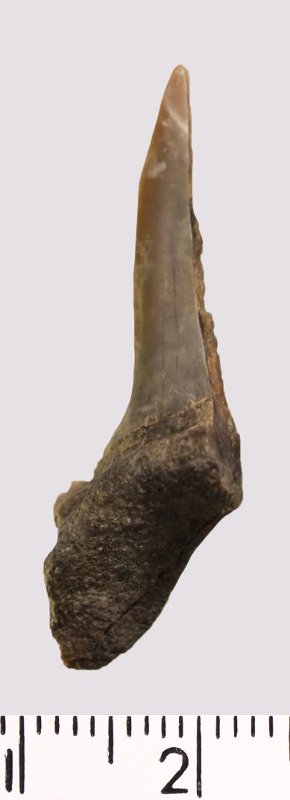 Зуб (фрагмент). Акула. Scapanorhynchus gigas Woodward, 1889. Классификация: Хордовые Chordata, Позвоночные Vertebrata, Хрящевые рыбы Chondrichthyes, Пластиножаберные Elasmobranchii