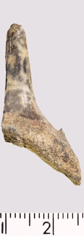 Зуб (фрагмент). Акула. Scapanorhynchus gigas Woodward, 1889. Классификация: Хордовые Chordata, Позвоночные Vertebrata, Хрящевые рыбы Chondrichthyes, Пластиножаберные Elasmobranchii