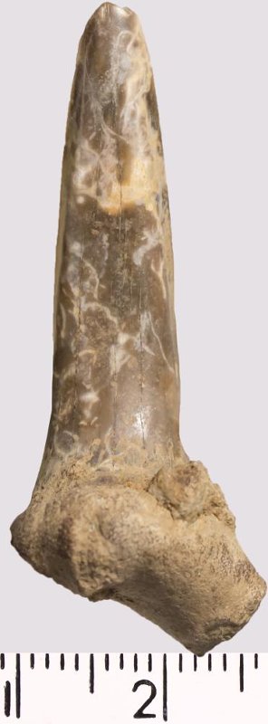Зуб. Акула. Scapanorhynchus gigas Woodward, 1889. Классификация: Хордовые Chordata, Позвоночные Vertebrata, Хрящевые рыбы Chondrichthyes, Пластиножаберные Elasmobranchii