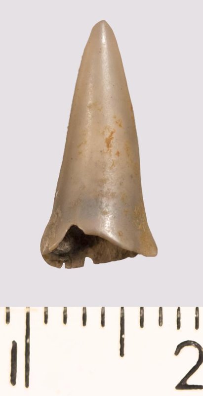 Зуб (фрагмент). Акула. Lamniformes gen. et sp. indet. Классификация: Хордовые Chordata, Позвоночные Vertebrata, Хрящевые рыбы Chondrichthyes, Пластиножаберные Elasmobranchii