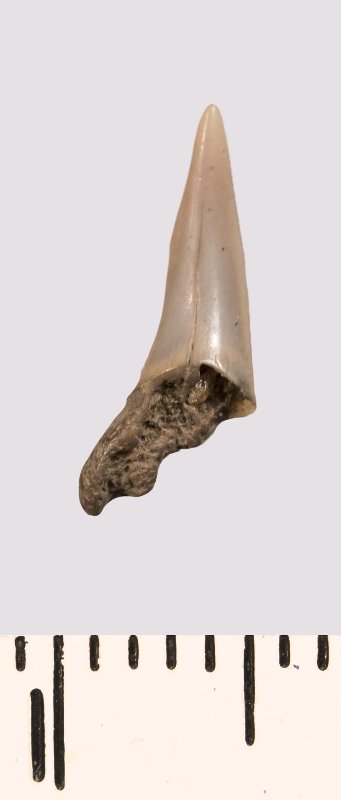 Зуб (фрагмент). Акула. Lamniformes gen. et sp. indet. Классификация: Хордовые Chordata, Позвоночные Vertebrata, Хрящевые рыбы Chondrichthyes, Пластиножаберные Elasmobranchii