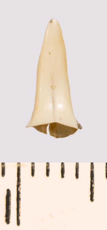 Зуб (фрагмент). Акула. Scapanorhynchus gracilis (Davis, 1890). Классификация: Хордовые Chordata, Позвоночные Vertebrata, Хрящевые рыбы Chondrichthyes, Пластиножаберные Elasmobranchii