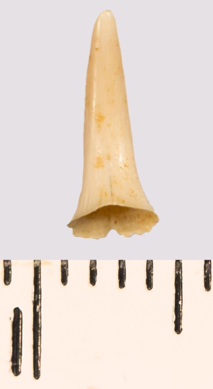 Зуб (фрагмент). Акула. Scapanorhynchus gracilis (Davis, 1890). Классификация: Хордовые Chordata, Позвоночные Vertebrata, Хрящевые рыбы Chondrichthyes, Пластиножаберные Elasmobranchii