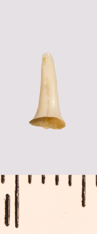 Зуб (фрагмент). Акула. Scapanorhynchus gracilis (Davis, 1890). Классификация: Хордовые Chordata, Позвоночные Vertebrata, Хрящевые рыбы Chondrichthyes, Пластиножаберные Elasmobranchii