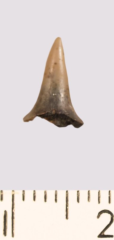 Зуб (фрагмент). Акула. Odontaspis venusta (Leriche, 1929). Классификация: Хордовые Chordata, Позвоночные Vertebrata, Хрящевые рыбы Chondrichthyes, Пластиножаберные Elasmobranchii