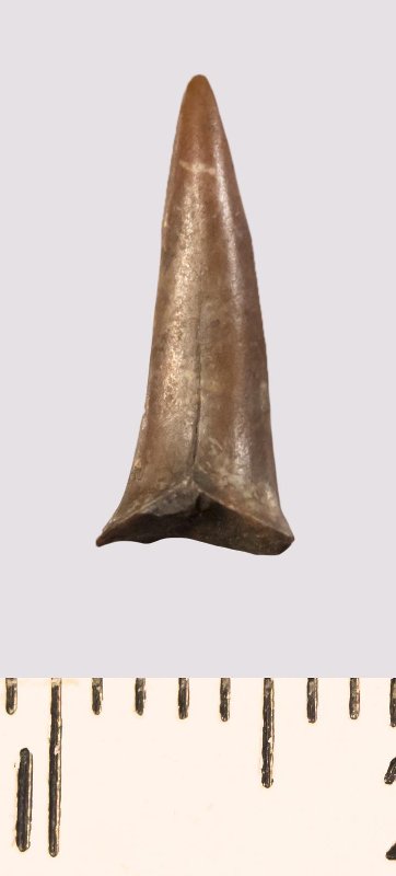 Зуб (фрагмент). Акула. Odontaspis venusta (Leriche, 1929). Классификация: Хордовые Chordata, Позвоночные Vertebrata, Хрящевые рыбы Chondrichthyes, Пластиножаберные Elasmobranchii