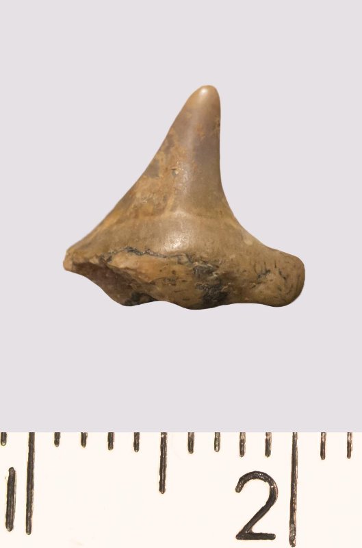 Зуб (фрагмент). Акула. Lamniformes gen. et sp. indet. Классификация: Хордовые Chordata, Позвоночные Vertebrata, Хрящевые рыбы Chondrichthyes, Пластиножаберные Elasmobranchii