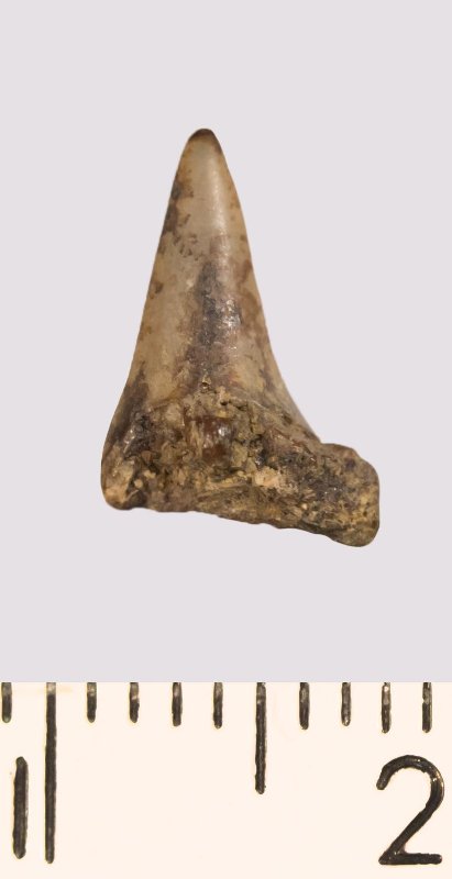 Зуб (фрагмент). Акула. Lamniformes gen. et sp. indet. Классификация: Хордовые Chordata, Позвоночные Vertebrata, Хрящевые рыбы Chondrichthyes, Пластиножаберные Elasmobranchii