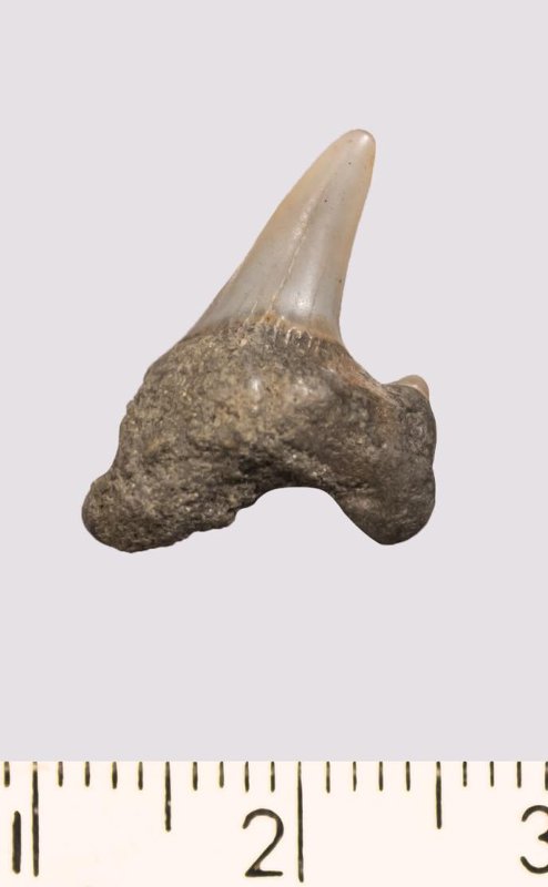 Зуб. Акула. Odontaspis macrorhiza (Cope) Leriche, 1902. Классификация: Хордовые Chordata, Позвоночные Vertebrata, Хрящевые рыбы Chondrichthyes, Пластиножаберные Elasmobranchii