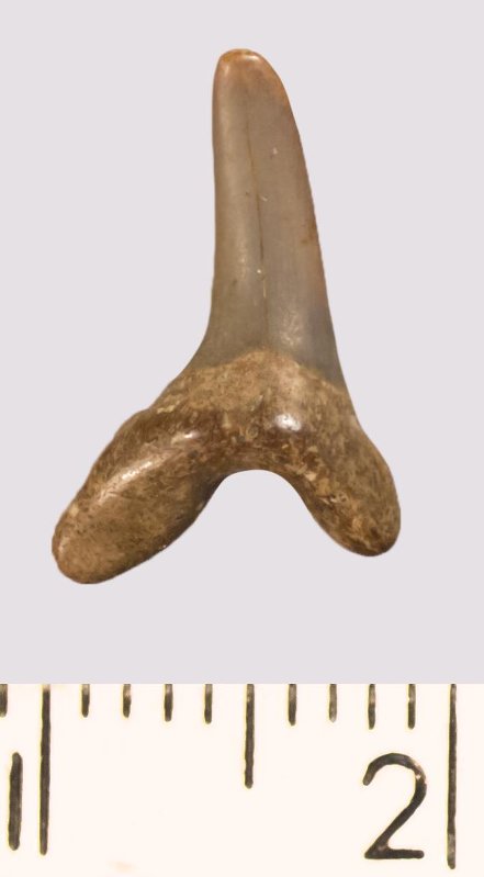 Зуб. Акула. Scapanorhynchus sp. Классификация: Хордовые Chordata, Позвоночные Vertebrata, Хрящевые рыбы Chondrichthyes, Пластиножаберные Elasmobranchii