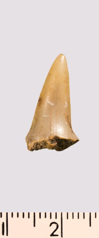 Зуб (фрагмент). Акула. Scapanorhynchus gigas Woodward, 1889. Классификация: Хордовые Chordata, Позвоночные Vertebrata, Хрящевые рыбы Chondrichthyes, Пластиножаберные Elasmobranchii