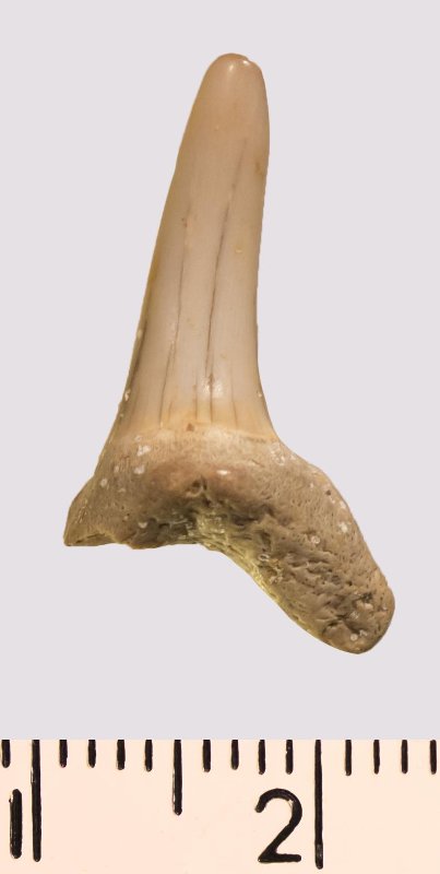 Зуб. Акула. Scapanorhynchus gigas Woodward, 1889. Классификация: Хордовые Chordata, Позвоночные Vertebrata, Хрящевые рыбы Chondrichthyes, Пластиножаберные Elasmobranchii