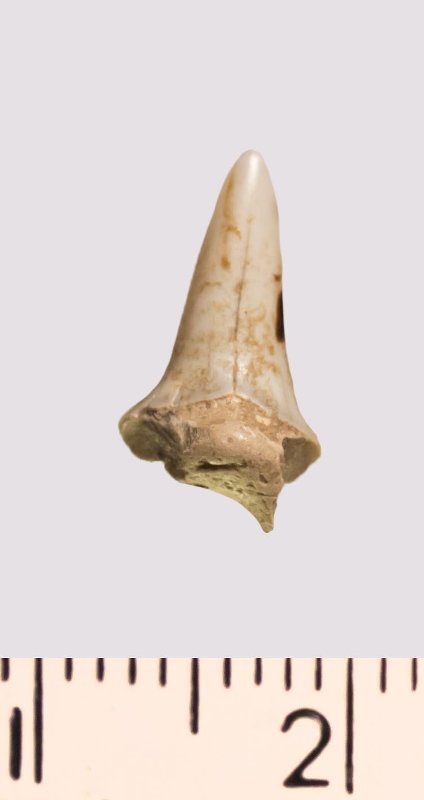 Зуб (фрагмент). Акула. Lamniformes gen. et sp. indet. Классификация: Хордовые Chordata, Позвоночные Vertebrata, Хрящевые рыбы Chondrichthyes, Пластиножаберные Elasmobranchii