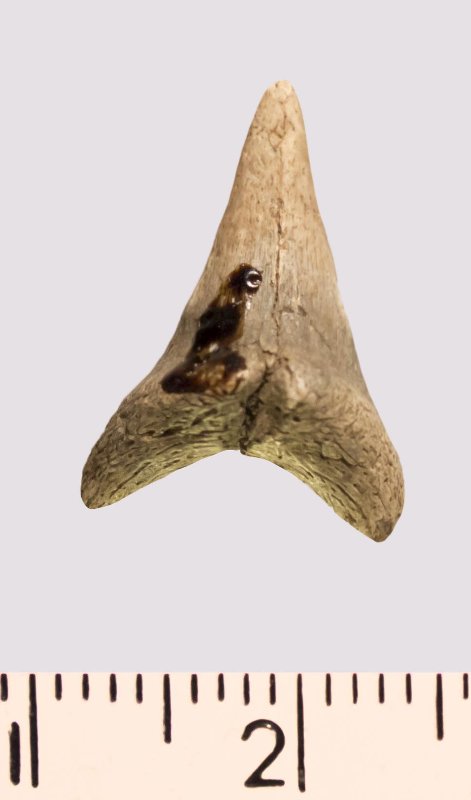 Зуб. Акула. Lamniformes gen. et sp. indet. Классификация: Хордовые Chordata, Позвоночные Vertebrata, Хрящевые рыбы Chondrichthyes, Пластиножаберные Elasmobranchii