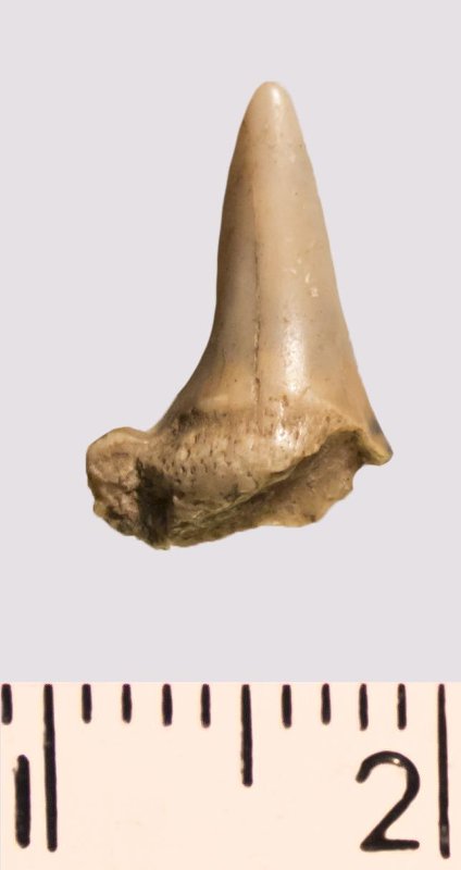 Зуб (фрагмент). Акула. Odontaspis venusta Leriche, 1906. Классификация: Хордовые Chordata, Позвоночные Vertebrata, Хрящевые рыбы Chondrichthyes, Пластиножаберные Elasmobranchii