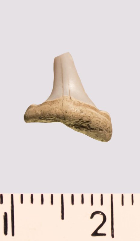 Зуб. Акула. Odontaspis venusta Leriche, 1906. Классификация: Хордовые Chordata, Позвоночные Vertebrata, Хрящевые рыбы Chondrichthyes, Пластиножаберные Elasmobranchii