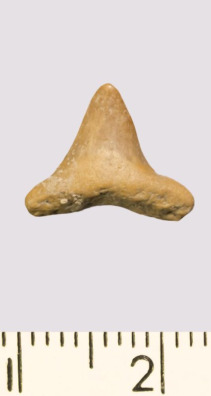 Зуб. Акула. Scapanorhynchus gigas Woodward, 1889. Классификация: Хордовые Chordata, Позвоночные Vertebrata, Хрящевые рыбы Chondrichthyes, Пластиножаберные Elasmobranchii