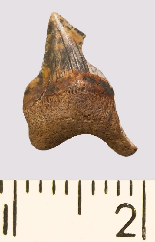Зуб (фрагмент). Акула. Anacorax santonicus Glueckman & Zhelezko, 1979. Классификация: Хордовые Chordata, Позвоночные Vertebrata, Хрящевые рыбы Chondrichthyes, Пластиножаберные Elasmobranchii
