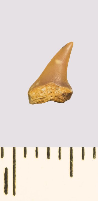 Зуб (фрагмент). Акула. Odontaspis subulata (Agassiz, 1843). Классификация: Хордовые Chordata, Позвоночные Vertebrata, Хрящевые рыбы Chondrichthyes, Пластиножаберные Elasmobranchii