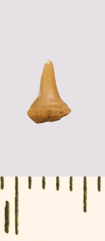 Зуб (фрагмент). Акула. Odontaspis subulata (Agassiz, 1843). Классификация: Хордовые Chordata, Позвоночные Vertebrata, Хрящевые рыбы Chondrichthyes, Пластиножаберные Elasmobranchii