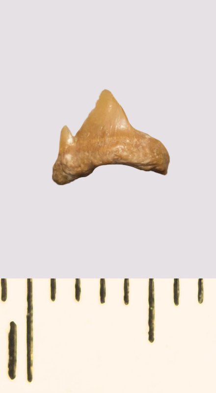 Зуб. Акула. Odontaspis subulata (Agassiz, 1843). Классификация: Хордовые Chordata, Позвоночные Vertebrata, Хрящевые рыбы Chondrichthyes, Пластиножаберные Elasmobranchii