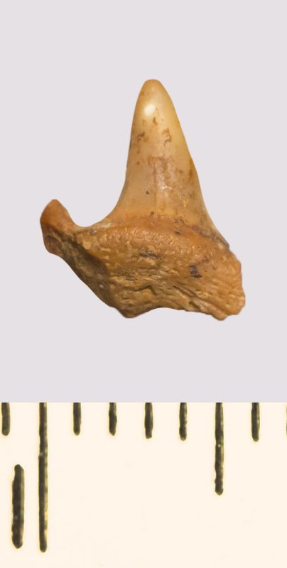 Зуб (фрагмент). Акула. Odontaspis macrorhiza (Cope) Leriche, 1902. Классификация: Хордовые Chordata, Позвоночные Vertebrata, Хрящевые рыбы Chondrichthyes, Пластиножаберные Elasmobranchii