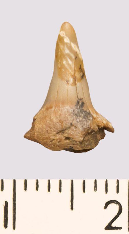 Зуб (фрагмент). Акула. Scapanorhynchus sp. Классификация: Хордовые Chordata, Позвоночные Vertebrata, Хрящевые рыбы Chondrichthyes, Пластиножаберные Elasmobranchii