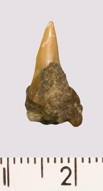 Зуб. Акула. Scapanorhynchus sp. Классификация: Хордовые Chordata, Позвоночные Vertebrata, Хрящевые рыбы Chondrichthyes, Пластиножаберные Elasmobranchii