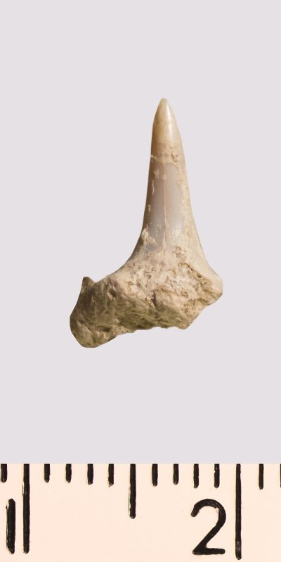 Зуб. Акула. Odontaspis venusta Leriche, 1906. Классификация: Хордовые Chordata, Позвоночные Vertebrata, Хрящевые рыбы Chondrichthyes, Пластиножаберные Elasmobranchii