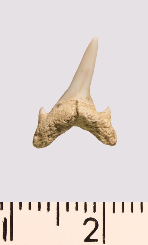 Зуб. Акула. Odontaspis venusta Leriche, 1906. Классификация: Хордовые Chordata, Позвоночные Vertebrata, Хрящевые рыбы Chondrichthyes, Пластиножаберные Elasmobranchii