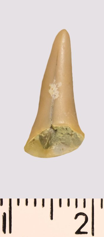 Зуб (фрагмент). Акула. Lamniformes gen. et sp. indet. Классификация: Хордовые Chordata, Позвоночные Vertebrata, Хрящевые рыбы Chondrichthyes, Пластиножаберные Elasmobranchii