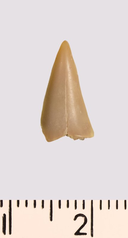 Зуб (фрагмент). Акула. Lamniformes gen. et sp. indet. Классификация: Хордовые Chordata, Позвоночные Vertebrata, Хрящевые рыбы Chondrichthyes, Пластиножаберные Elasmobranchii