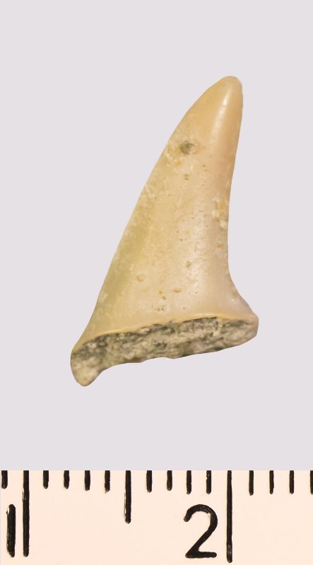 Зуб (фрагмент). Акула. Lamniformes gen. et sp. indet. Классификация: Хордовые Chordata, Позвоночные Vertebrata, Хрящевые рыбы Chondrichthyes, Пластиножаберные Elasmobranchii