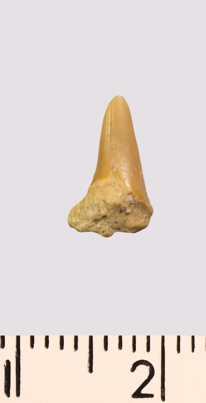 Зуб (фрагмент). Акула. Lamniformes gen. et sp. indet. Классификация: Хордовые Chordata, Позвоночные Vertebrata, Хрящевые рыбы Chondrichthyes, Пластиножаберные Elasmobranchii