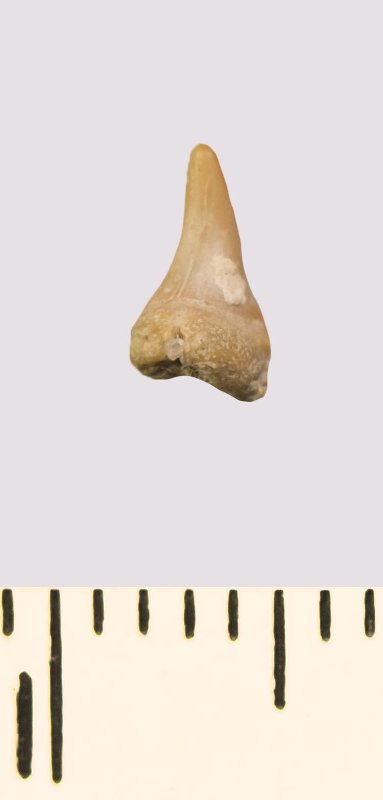 Зуб (фрагмент). Акула. Lamniformes gen. et sp. indet. Классификация: Хордовые Chordata, Позвоночные Vertebrata, Хрящевые рыбы Chondrichthyes, Пластиножаберные Elasmobranchii