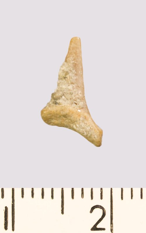 Зуб. Акула. Scapanorhynchus sp. Классификация: Хордовые Chordata, Позвоночные Vertebrata, Хрящевые рыбы Chondrichthyes, Пластиножаберные Elasmobranchii