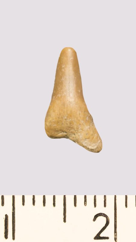 Зуб. Акула. Scapanorhynchus sp. Классификация: Хордовые Chordata, Позвоночные Vertebrata, Хрящевые рыбы Chondrichthyes, Пластиножаберные Elasmobranchii