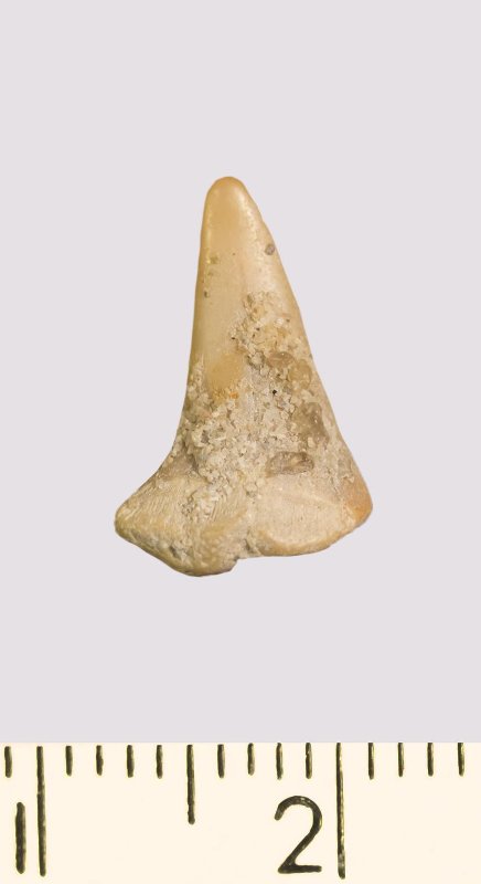 Зуб (фрагмент). Акула. Scapanorhynchus gigas Woodward, 1889. Классификация: Хордовые Chordata, Позвоночные Vertebrata, Хрящевые рыбы Chondrichthyes, Пластиножаберные Elasmobranchii