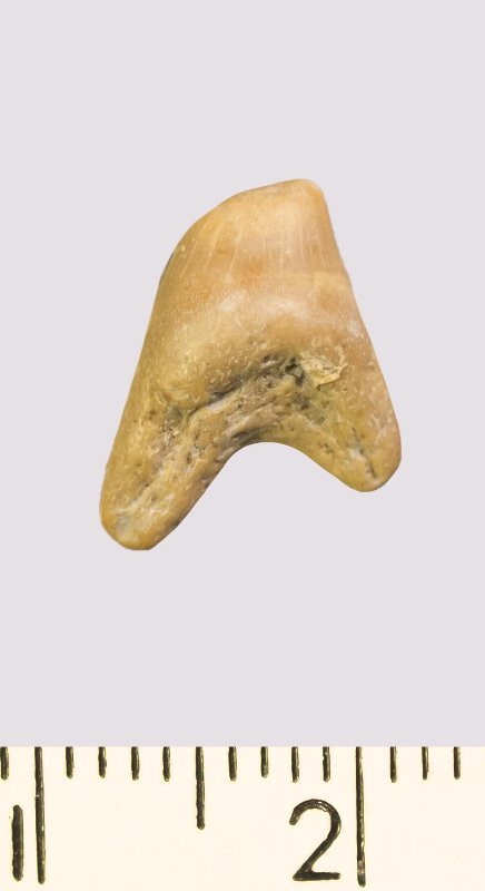 Зуб (фрагмент). Акула. Scapanorhynchus gigas Woodward, 1889. Классификация: Хордовые Chordata, Позвоночные Vertebrata, Хрящевые рыбы Chondrichthyes, Пластиножаберные Elasmobranchii