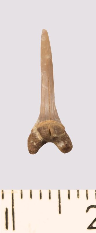 Зуб. Акула. Scapanorhynchus rhaphiodon Agassiz, 1843. Классификация: Хордовые Chordata, Позвоночные Vertebrata, Хрящевые рыбы Chondrichthyes, Пластиножаберные Elasmobranchii
