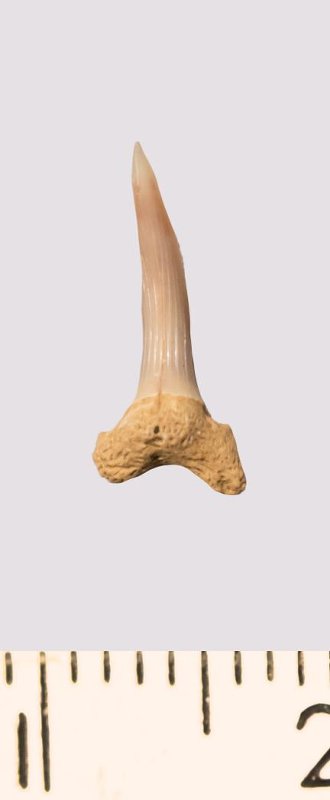 Зуб. Акула. Scapanorhynchus rhaphiodon Agassiz, 1843. Классификация: Хордовые Chordata, Позвоночные Vertebrata, Хрящевые рыбы Chondrichthyes, Пластиножаберные Elasmobranchii