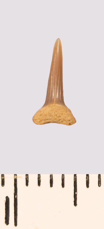 Зуб. Акула. Scapanorhynchus rhaphiodon Agassiz, 1843. Классификация: Хордовые Chordata, Позвоночные Vertebrata, Хрящевые рыбы Chondrichthyes, Пластиножаберные Elasmobranchii
