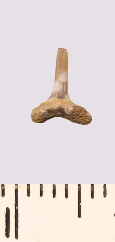 Зуб. Акула. Scapanorhynchus rhaphiodon Agassiz, 1843. Классификация: Хордовые Chordata, Позвоночные Vertebrata, Хрящевые рыбы Chondrichthyes, Пластиножаберные Elasmobranchii