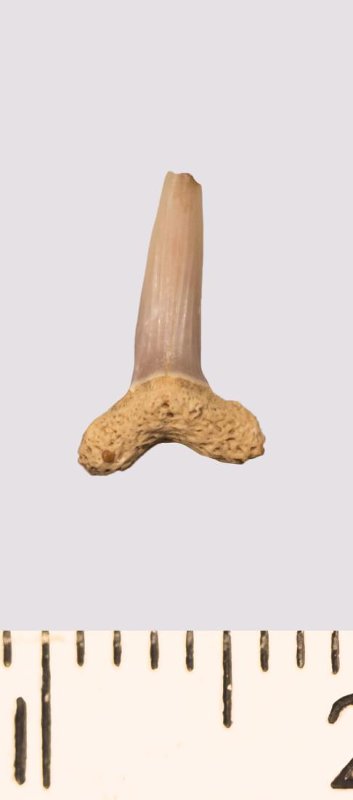 Зуб. Акула. Scapanorhynchus rhaphiodon Agassiz, 1843. Классификация: Хордовые Chordata, Позвоночные Vertebrata, Хрящевые рыбы Chondrichthyes, Пластиножаберные Elasmobranchii