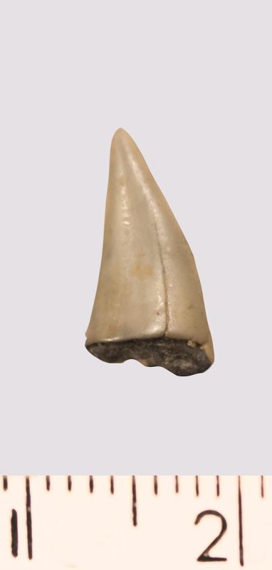 Зуб (фрагмент). Акула. Odontaspis macrorhiza (Cope) Leriche, 1902. Классификация: Хордовые Chordata, Позвоночные Vertebrata, Хрящевые рыбы Chondrichthyes, Пластиножаберные Elasmobranchii