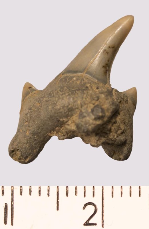 Зуб. Акула. Odontaspis macrorhiza (Cope) Leriche, 1902. Классификация: Хордовые Chordata, Позвоночные Vertebrata, Хрящевые рыбы Chondrichthyes, Пластиножаберные Elasmobranchii