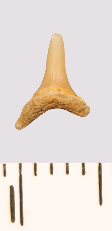 Зуб. Акула. Scapanorhynchus rhaphiodon Agassiz, 1843. Классификация: Хордовые Chordata, Позвоночные Vertebrata, Хрящевые рыбы Chondrichthyes, Пластиножаберные Elasmobranchii