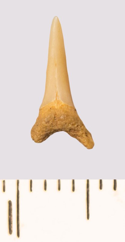 Зуб. Акула. Scapanorhynchus rhaphiodon Agassiz, 1843. Классификация: Хордовые Chordata, Позвоночные Vertebrata, Хрящевые рыбы Chondrichthyes, Пластиножаберные Elasmobranchii